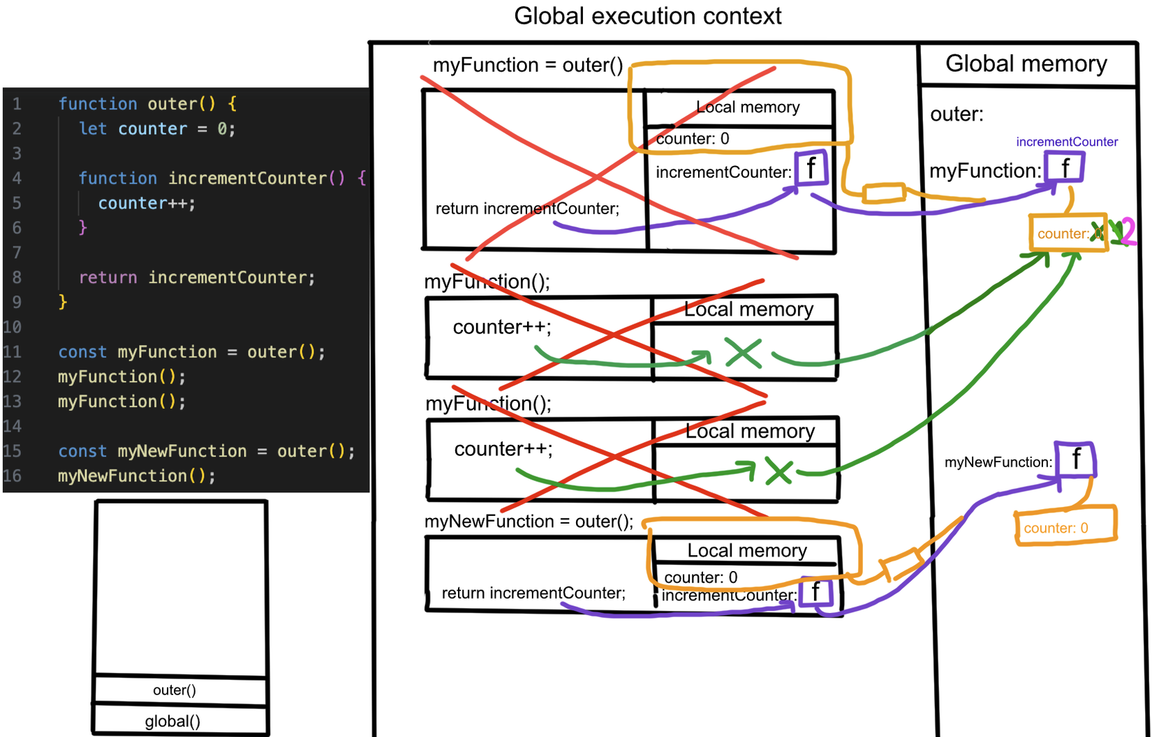 Thật ra khi dòng 11 được thực thi, ở bước cuối khi trả về (return) thì JavaScript không chỉ lưu code trong function incrementCounter vào myFunction, mà còn mang theo dữ liệu xung quanh (lexical scope) mà code trong function có tham chiếu tới. Chú ý nét vẽ màu cam nhé.