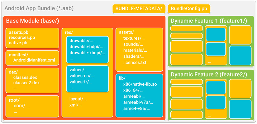 App bundle là các tệp nhị phân được ký và sắp xếp mã và resources trong module. Google Play sau đó sử dụng app bundle để generate các APK khác nhau tới users như base APk, dynamic feature APK, configuration APK và multi-APK. Các thư mục được tô màu xanh như "drawable/, value/, lib/" đại diện cho mã code và resources mà Google Play sử dụng để tạo cấu hình APK cho mỗi module