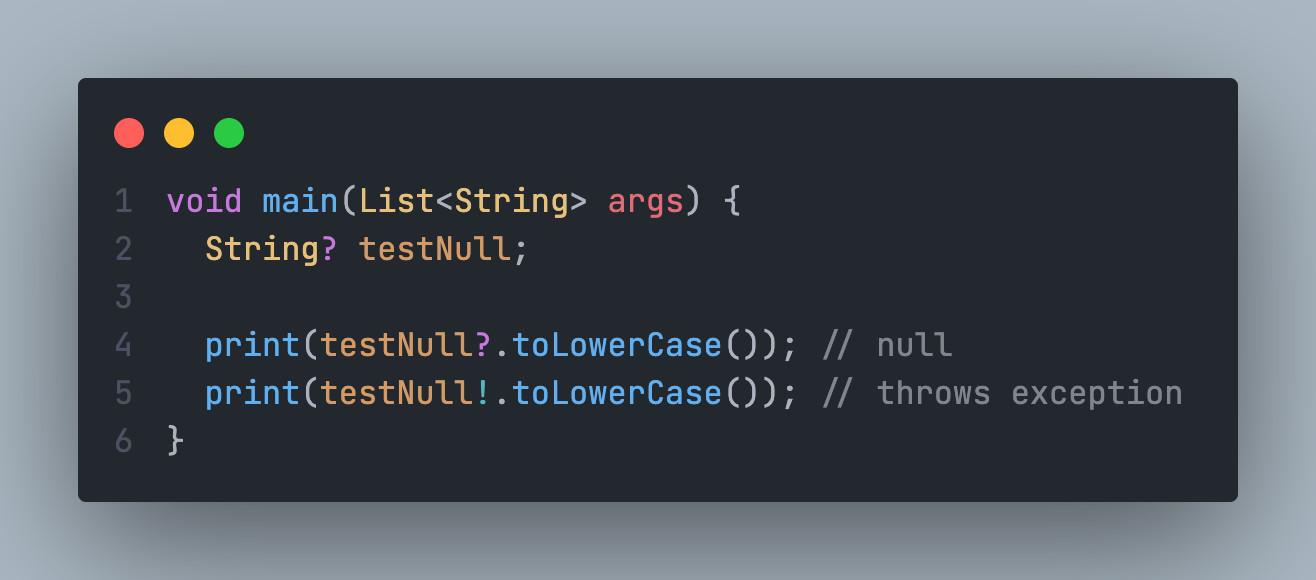 Ta thấy rằng null + ! = crash vì biến có giá trị null sẽ bị lỗi ở runtime vì vậy chỉ nên sử dụng ! khi bạn biết chắc rằng giá trị của biến sẽ không bao giờ là null.