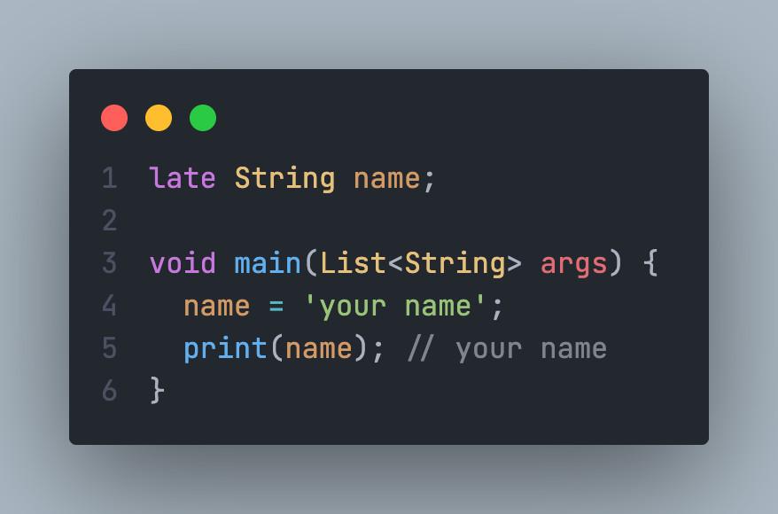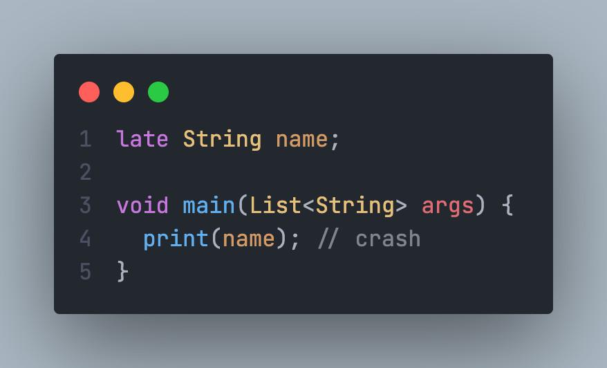 Nếu bạn muốn khai báo một biến phải mang giá trị có ý nghĩa khi runtime chứ không phải là null như khi dùng Question Mark: ? và ta sẽ khởi tạo giá trị cho nó sau chứ không phải ngay lúc này thì ta có thể dùng keyword late trước khai báo biến. Với late, nếu bạn quên khởi tạo giá trị cho biến, nó sẽ có giá trị null dẫn đến crash chương trình của bạn khi runtime.