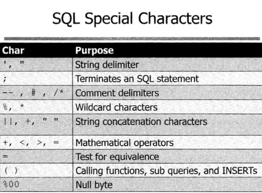 Mỗi RDBMS có hệ thống các ký tự đặc biệt riêng cho các mục đích cụ thể. Tuy nhiên có những mục đích có thể có nhiều ký tự cùng được sử dụng.