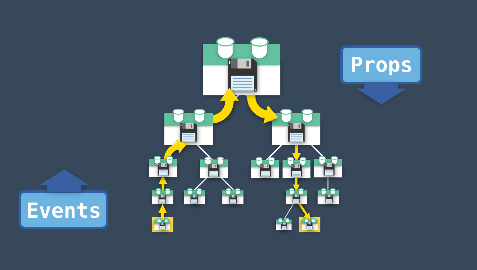- Khi một component A muốn thay đổi trạng thái state của nó, một component B họ hàng xa của A cũng sử dụng state đó, như vậy các component cần giao tiếp để biết được sự thay đổi state. Cách giao tiếp thông thường đó là sử dụng event để giao tiếp từ component A lên các component cha của A, rồi từ các component cha sẽ truyền xuống các props xuống để chia sẻ dữ liệu đến component B. Tuy nhiên cách làm như vậy có thể trở lên rất phức tạp.