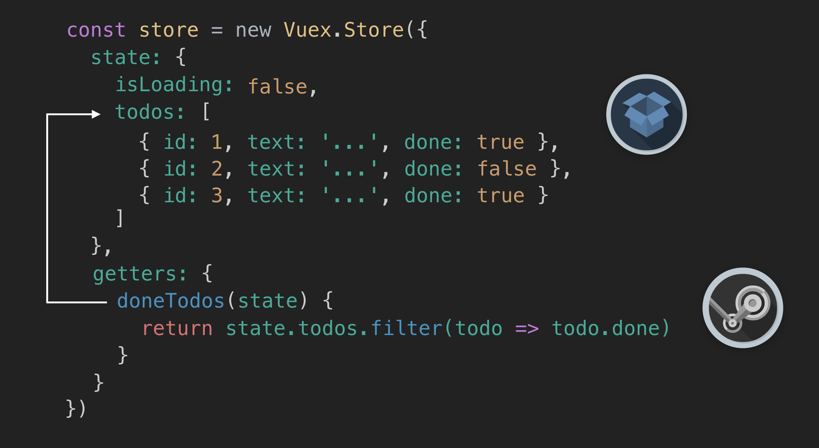 actions, trước tiên chúng ta commit mutationSET_lOADING_STATUS, lúc này stateisLoadingsẽ được chuyển từ false sang true. Ở trong actions, chúng ta cũng có thể dùng axios để gọi api, như bên trên khi có response trở về, chúng ta lại thực hiện commit mutationSET_LOADING_STATUS, lúc này stateisLoadingcủa chúng ta sẽ có giá trị là false. Sau đó chúng ta tiếp tục commit mutationSET_TODOS, statetodoscủa chúng ta sẽ có giá trị làresponse.data.todos,responsetrả về từ api. - Nếu trong trường hợp chúng ta chỉ muốn truy xuất các phần tử todo với nhãn là done, chúng ta có thể dùng