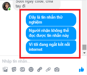 Để kiểm tra điều này, bạn có thể thử nghiệm bằng cách sau. Mở hộp hội thoại nhắn tin cho 1 người bất kỳ, ngắt kết nối internet, soạn tin nhắn và gửi, tin nhắn sẽ được hiển thị ngay lập tức trên bảng hội thoại trong khi máy tính của bạn đang không có mạng. Bạn mở lại internet và reload lại trang, dòng tin nhắn kia đã biến mất.