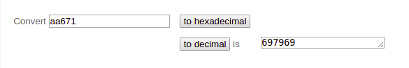 Bây giờ chọn 5 ký tự đầu tiên (aa671) và chuyển đổi từ giá trị hex thành số thập phân. Bạn cũng có thể sử dụng công cụ trực tuyến như statman.info/conversions/hexadecimal.html để tính toán .