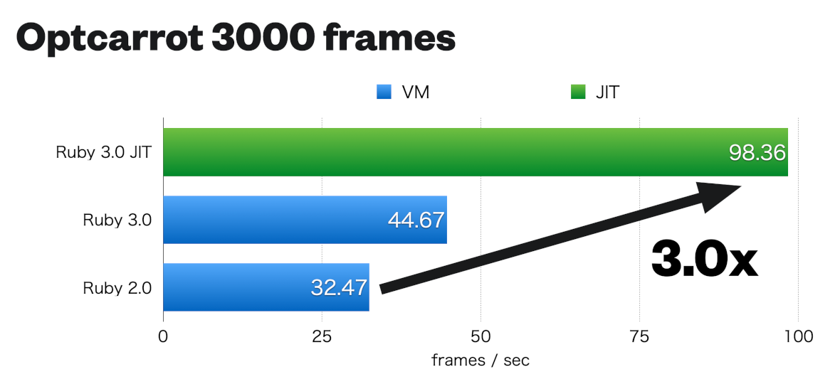 Như các bạn đã đọc ở trên thì một trong những trọng tâm chính của Ruby 3 là hiệu suất, đội phát triển đã đặt ra một mục tiêu rất tham vọng là làm cho Ruby nhanh gấp 3 lần, trên các bài test và các thông kê trước khi phát hành thì nhà phát triển đã chỉ ra rõ điều này !