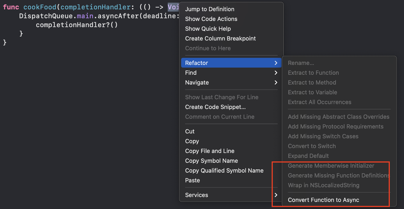 Nếu bạn có code đang sử dụng completionHandler, bạn có thể refactor lại chúng một cách dễ dàng. Tái cấu trúc mới giúp chuyển sang mã bất đồng bộ. “Convert Call to Async Alternative” có sẵn trên các lệnh gọi có completionHandler làm đối số cuối cùng của chúng, và refactor lại chúng để sử dụng các tính năng ngôn ngữ bất đồng bộ mới.