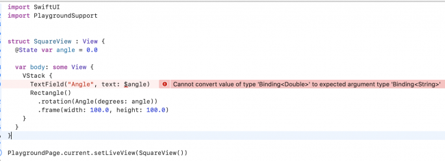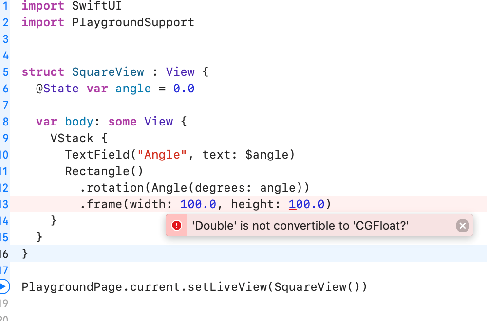Nhìn lại code , Bạn có thể nhận ra vấn đề ở đây là gì ?- một gợi ý ,không liên quan đến việc chuyển đổi ‘Double’ thành ‘CGFloat’! Bây giờ hãy mở swiftui.playground thực thi dòng code (trên Xcode11.4, Swift 5.2.) Bạn sẽ thấy rằng trình biên dịch cung cấp cho bạn một thông báo lỗi hữu ích và hữu dụng hơn nhiều: