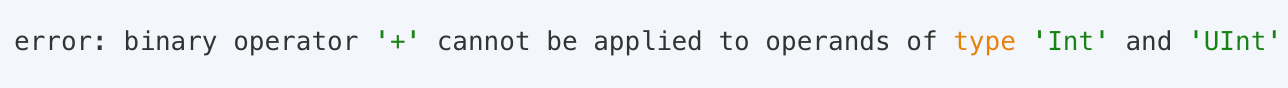 Đoạn code này muốn thêm một Int vào UInt nhưng Xcode không biên dịch. Trước Swift 5.2, trình biên dịch đã hiển thị lỗi sau: