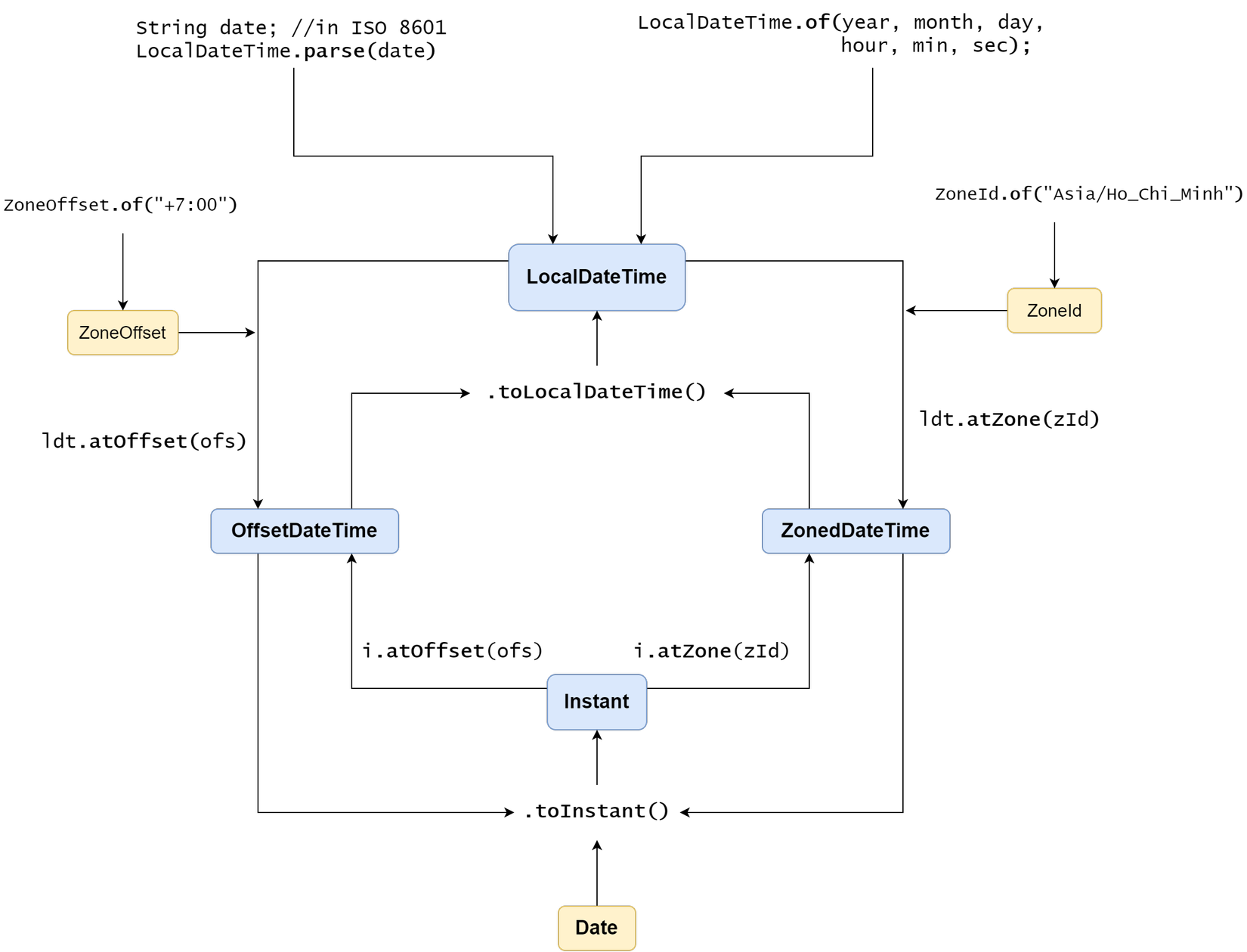 Instant: biển diễn một epoch time với độ chính xác nanosecond. OffsetDateTime: lưu ngày giờ và một offset (không kèm múi giờ) ZonedDateTime: lưu ngày giờ kèm theo múi giờ (zone ID) |