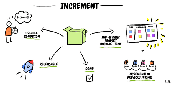 Chúng ta cùng quay lại xem mục đích của Sprint là gì ? Đó là cung cấp cho nhóm phát triển đủ thời gian để chuyển đổi một số hạng mục trong Product Backlog thành một phần gia tăng (Increment - là phần thêm vào của tất cả những Increment trước đó, được kiểm định kỹ càng, đảm bảo tất cả Increment tích hợp tốt. Để cung cấp được giá trị, Increment phải sử dụng được.). Định nghĩa hoàn thành của phần gia tăng phụ thuộc vào mỗi nhóm và những người liên quan phải hiểu rõ. Đối với một số nhóm phát triển, phần gia tăng hoàn thành khi code được merge vào repo. Với một số nhóm khác đó là phần gia tăng đã được triển khai trên một số môi trường như develop, staging ...