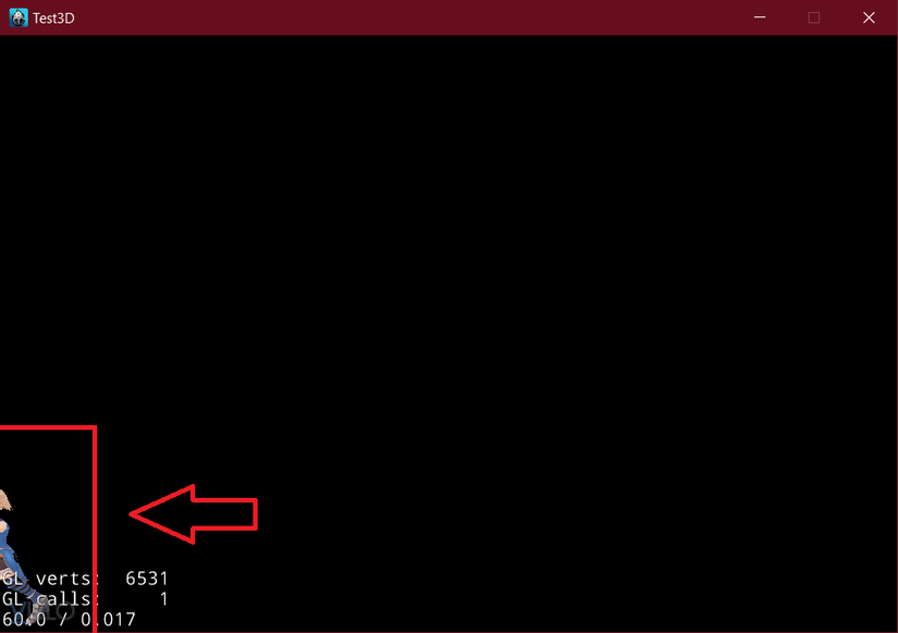 Sau khi chạy các bạn sẽ thấy một màn hình đen thui. Tuy nhiên nhìn kĩ sẽ thấy bé gái đứng chênh vênh ở góc (như hình). Đó là do Cocos đặt gốc toạ độ của mọi đối tượng ở góc trái dưới của chúng. Dòng this.addChild(girl) sẽ thêm bé gái là một đối tượng con của GameLayer. GameLayer có thể hiểu là một hình chữ nhật trong suốt nằm phủ lên toàn bộ màn hình game, do đó ta thấy bé gái với toạ độ (0, 0, 0) sẽ nằm ở góc trái dưới. Các bạn thay toạ độ bằng số khác sẽ thấy bé gái dịch chuyển tương ứng. Dưới là 2 hình khi set toạ độ tương ứng là (0, 0, 0) và (100, 100, 0).