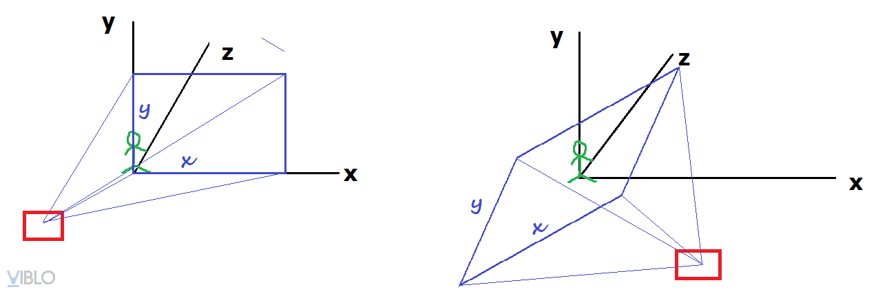 Để có thể nhìn bé gái rõ hơn, các bạn cần điều chỉnh camera (vị trí, góc nhìn) lại. Lưu ý là kể từ khi điều chỉnh camera thì toạ độ trên màn hình sẽ không còn là toạ độ 2 chiều nữa mà sẽ là toạ độ 3 chiều. Các bạn có thể tạm hiểu qua hình minh hoạ vẽ bằng Paint