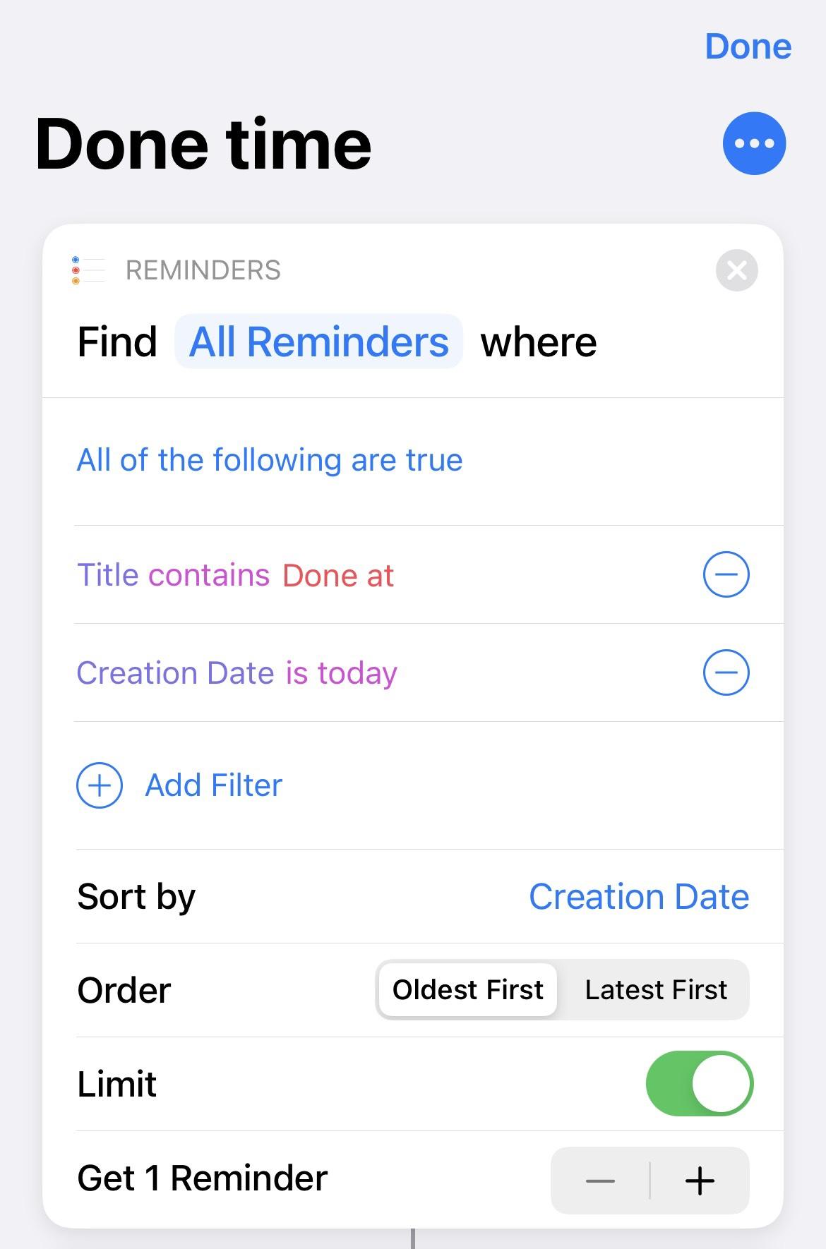 LINE1: Đầu tiên mình sẽ lọc trong reminders (tạm gọi là DB) để check xem ngày hôm nay mình đã check done time chưa. Cách lọc thì mình dựa vào thời gian hôm nay và tiêu đề là "Done time" (- tiêu đề này mình tự đặt sao cho dễ lọc nhất).