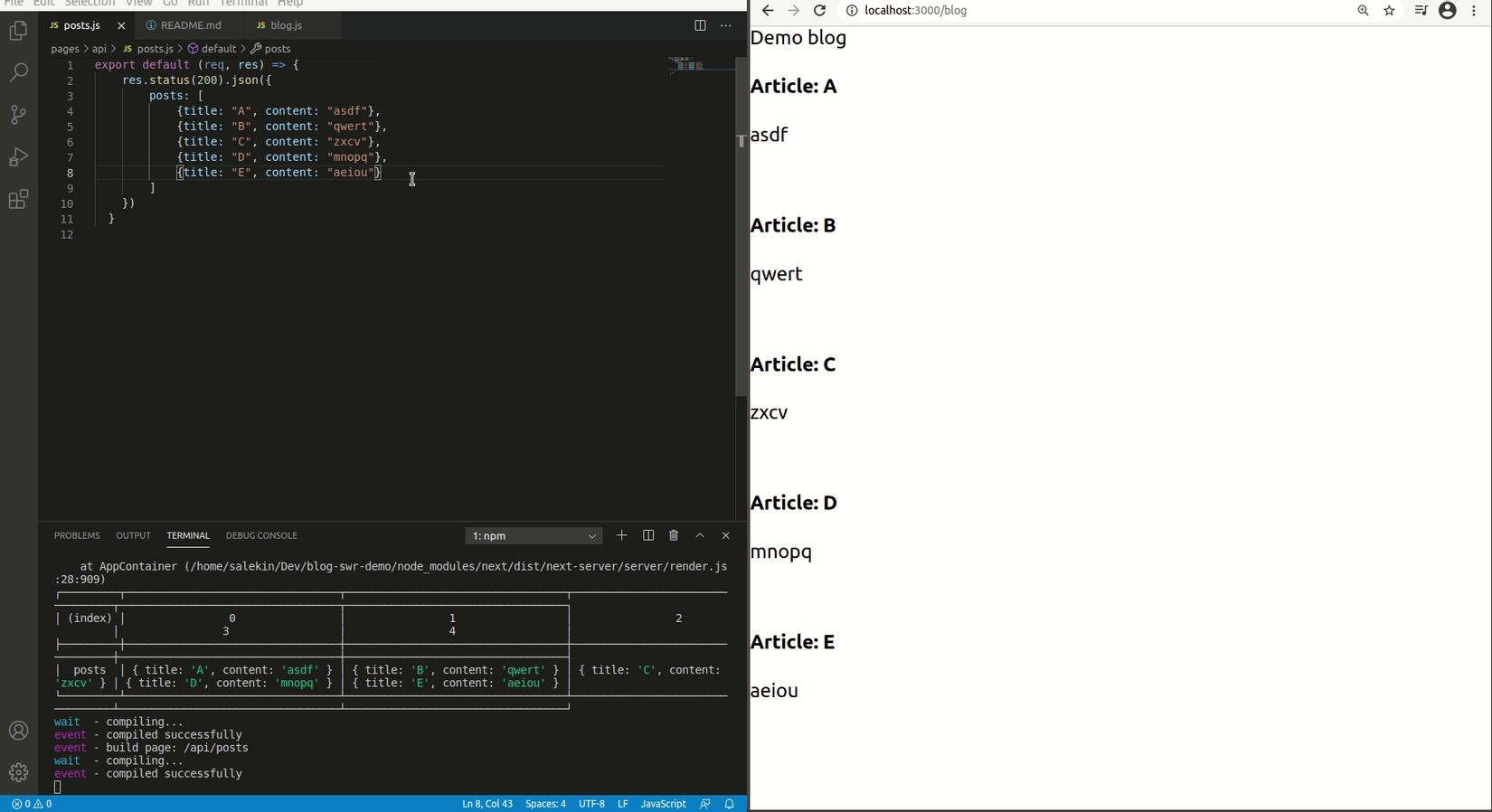 And create our blog component and also import the useSWR hook from the plugin we just installed