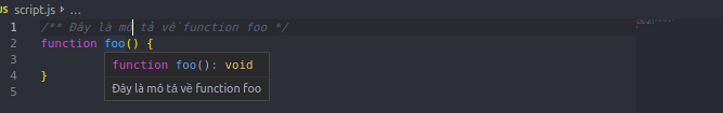 Khi đưa chuột vào function foo ta sẽ thấy một mô tả về hàm này: