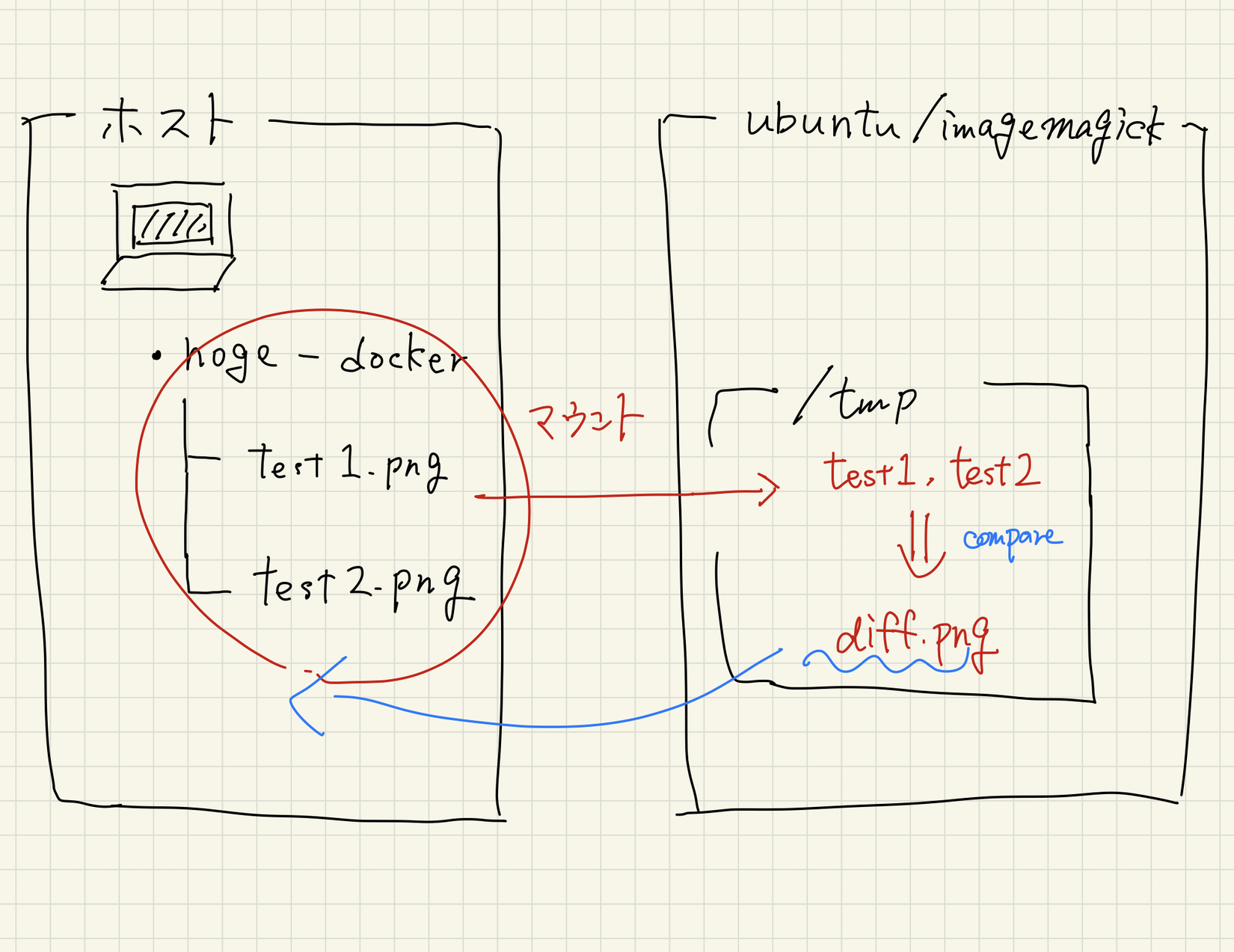 Trước tiên , hãy thực hiện công việc này trong thư mục hoge-docker. Khi bạn tự thử, hãy tiếp tục trong khi thay thế nó bằng thư mục bạn đã tạo. Thư mục hoge-docker chỉ chứa các hình ảnh test1.png và test2.png mà bạn muốn so sánh.