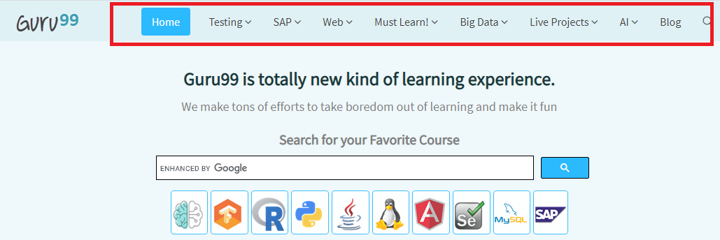 Ví dụ 2: Hãy xem xét trang chủ của trang web guru99.com có nhiều thành phần như: