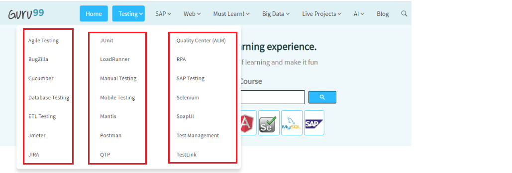 Click vào dropdown 'Testing' và xem các thành phần con khác nhau của thành phần ''Testing'. Vì vậy các thành phần con được hiển thị là: Agile Testing, BugZilla, Cucumber, Postman, QTP, v.v..