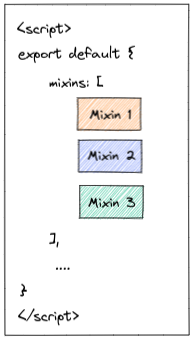 Khi bạn đọc code bạn sẽ thấy tuy cùng một tính năng nhưng code của nó lại bị rải rác theo từng khối khác nhau rất khó để theo dõi. Đây cũng chính là một phần lý do mà mixin bước vào cuộc chơi vi nó cho phép bạn gom nhóm logic lại chung lại thành từng mixin và chỉ cần sử dụng nó lại trong component của bạn như sau: