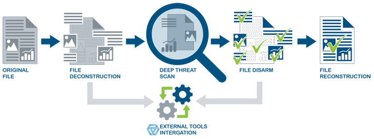 Trên hình là luồng hoạt động cơ bản nhất của công nghệ CDR. Đầu tiên, file ban đầu sẽ được giải cấu trúc (deconstruction). Tại đây, từ một file ban đầu người ta sẽ đưa nó về một cấu trúc, định dạng khác phù hợp hơn để xử lí. Tiếp theo, file sau khi đã giải cấu trúc sẽ được quét các nội dung không phù hợp (disarm) và loại bỏ các nội dung này khỏi file. Cuối cùng, từ file đã giải cấu trúc đã sạch các nội dung disarm, người ta sẽ tái cấu trúc nó trở về định dạng ban đầu.