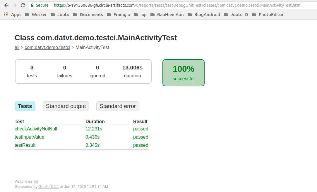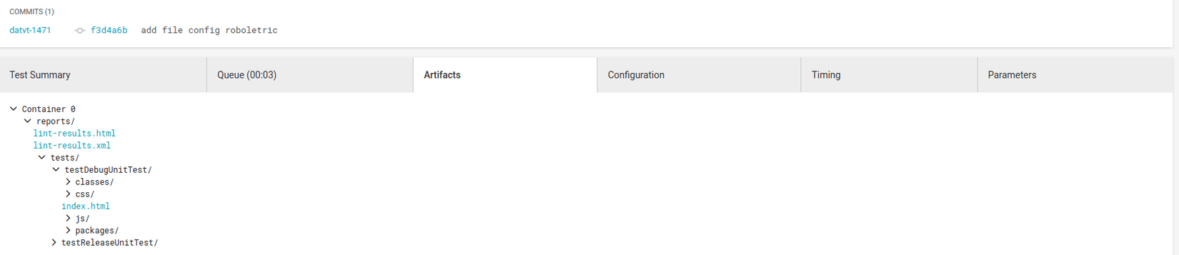Tuy đã success tuy nhiên file MainActivityTest của mình lại chưa hề được chạy. Các bạn có thể kiểm tra tại Artifacts trong Circle CI