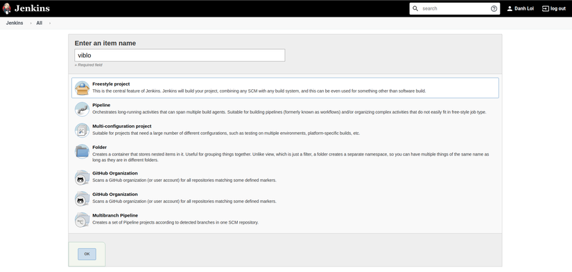 - Quay trở lại Jenkins và tạo 1 new item:![]() Mình tạo 1 item mới như thế này Mình tạo 1 item mới như thế này