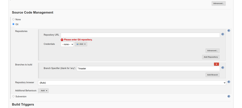 Sau đó chúng ta sẽ chọn phần Source Code và cấu hình git.- Nhập repository của chúng ta: