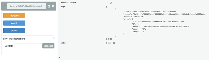 Tạo trx increase() sẽ emit ra event, như các bạn thấy phần logs sẽ show ra count và sender.