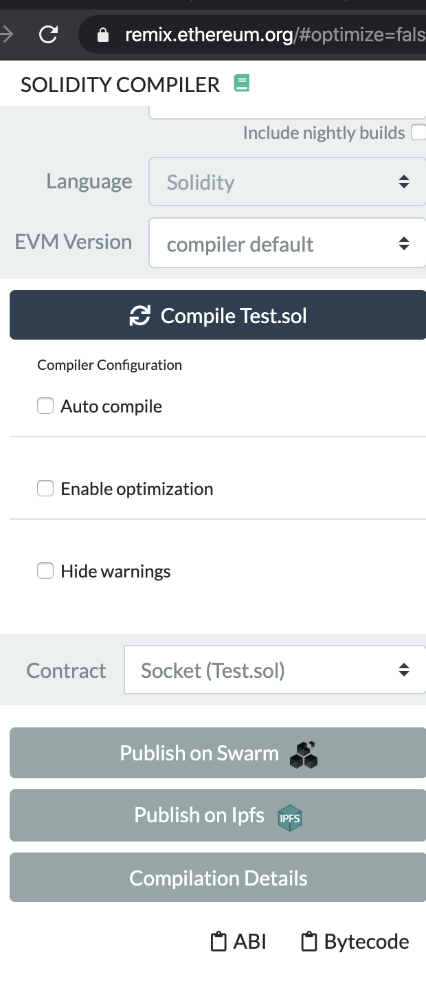 Sau đó là thêm file abi của contract chúng ta vừa deploy. Ngay ở tab remix chúng ta vừa deploy chuyển sang compiler thì sẽ thấy một phần để lấy ABI, click thẳng vào đó là ABI sẽ được copy vào clipboard: