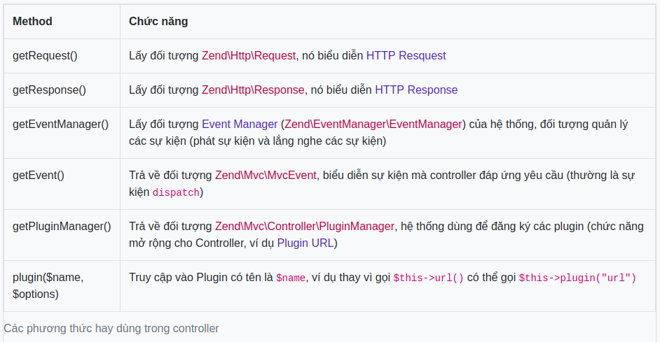 Các controller bạn xây dựng, kế thừa từ lớp cơ sở của ZF là AbstractActionController hoặc AbstractController, như vậy tại các phương thức của controller có thể gọi các phương thức sau: