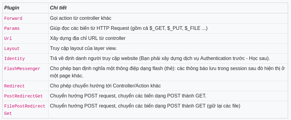 Trong bài viết trước mình đã nói về controller, cách tạo và đăng ký controller. Trong bài hôm nay mình sẽ tiếp tục nói về phần mở rộng của controller đó là controller plugin. ộTrong Controller có một số plugin như plugin layout, url, redirect,..
