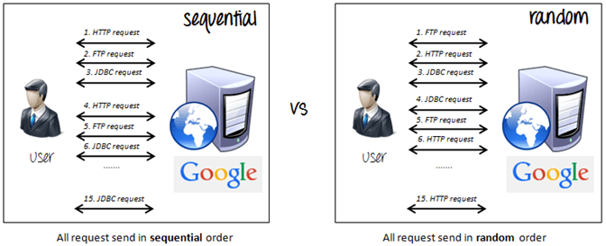 Theo sequential, các request được gửi lần lượt theo thứ tự HTTP request ->FTP request->JDBC request trong mỗi vòng lặp. Nếu thứ tự là random, các request sẽ được gửi ngẫu nhiên, FTP request ->HTTP request->JDBC request Hoặc là JDBC request ->FTP request->HTTP request trong mỗi vòng lặp.