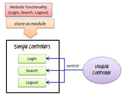 Các ứng dụng web bao gồm các đơn vị chức năng nhỏ (ví dụ: Đăng nhập, Tạo tài khoản, Đăng xuất ...). Chức năng này có thể được lưu trữ trong Simple Controller dưới dạng "modules". Module Controller sẽ chọn modules cần chạy.
