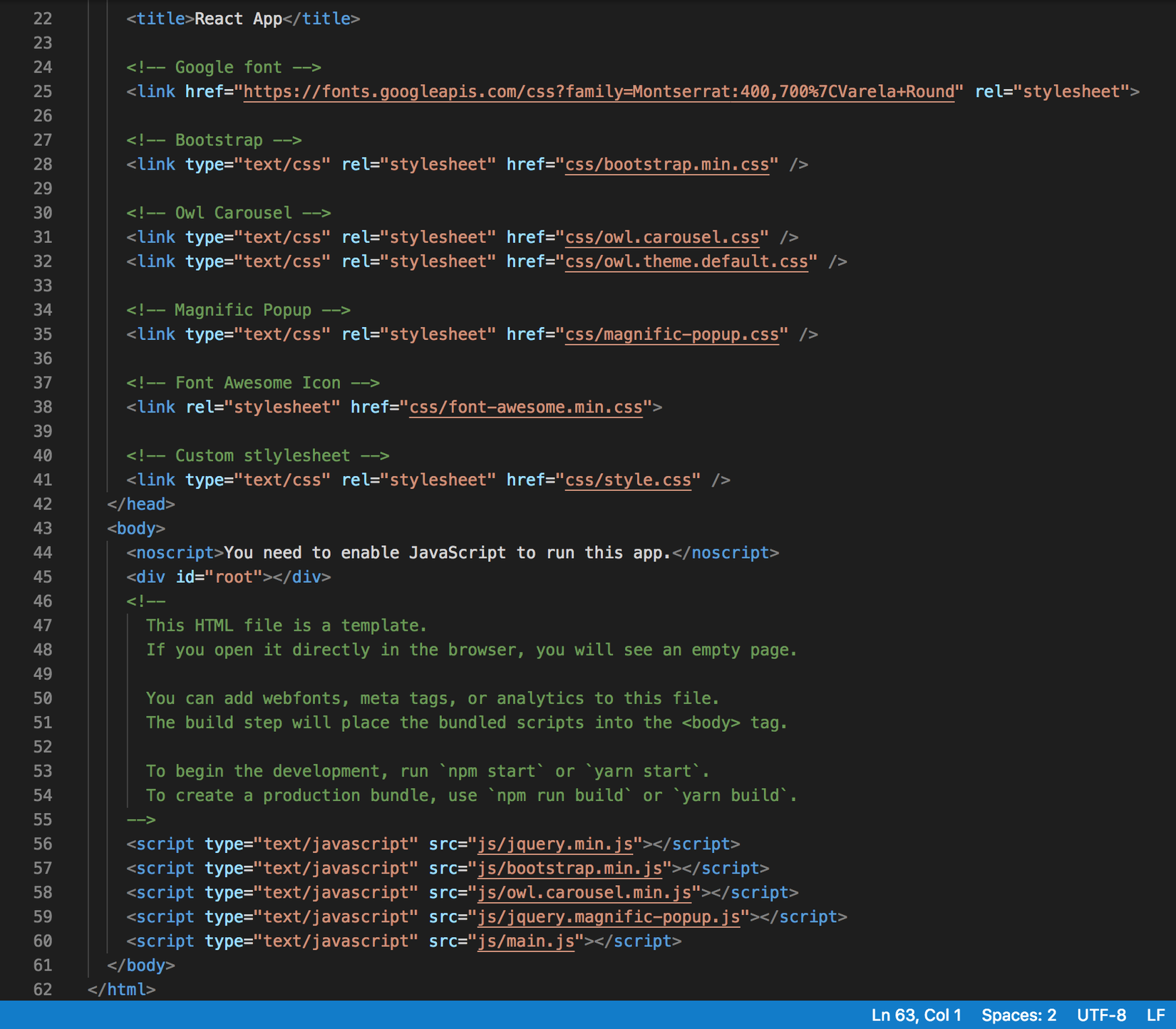 Khi đã cleared component, quay lại index.html từ bên trong Creative Template. Sao chép mọi thứ trong phần tử <body> và dán vào nút <div className=”App”> trong dự án React của bạn. Và ta thấy vô số lỗi
