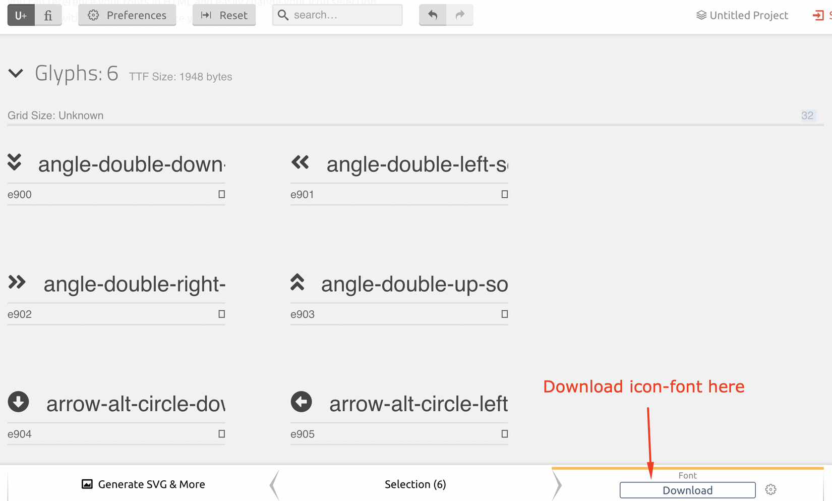 Lúc này sẽ nhảy sang page list icon-font. Các bạn có thể tuỳ ý thay đổi tên và download icon-font về sử dụng. Nó sẽ là 1 gói icon-font như bao library khác.