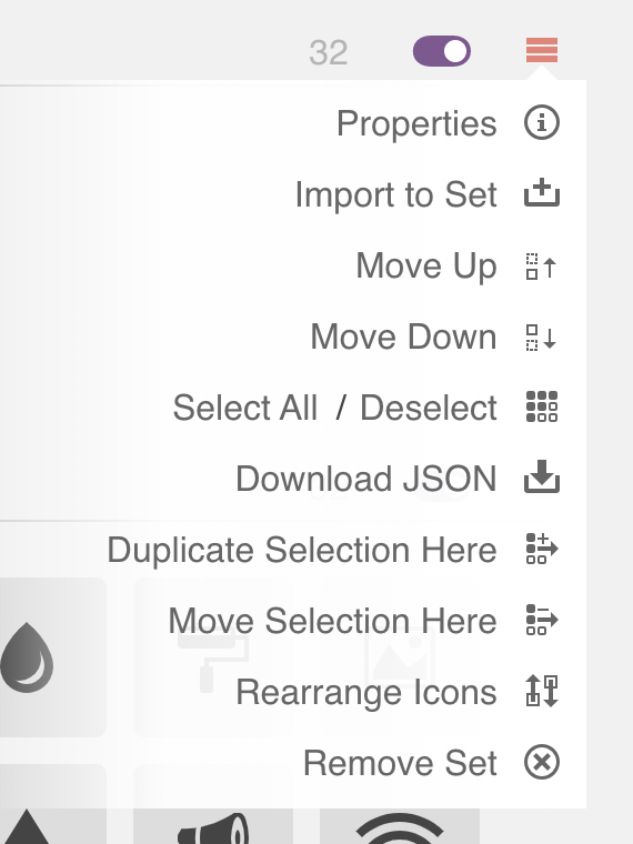 - B2: Config list icon font. Các bạn có thể sắp xếp, tuỳ biến list icon-font của các bạn bằng cách click vào icon nhỏ ở bên phải màn hình.