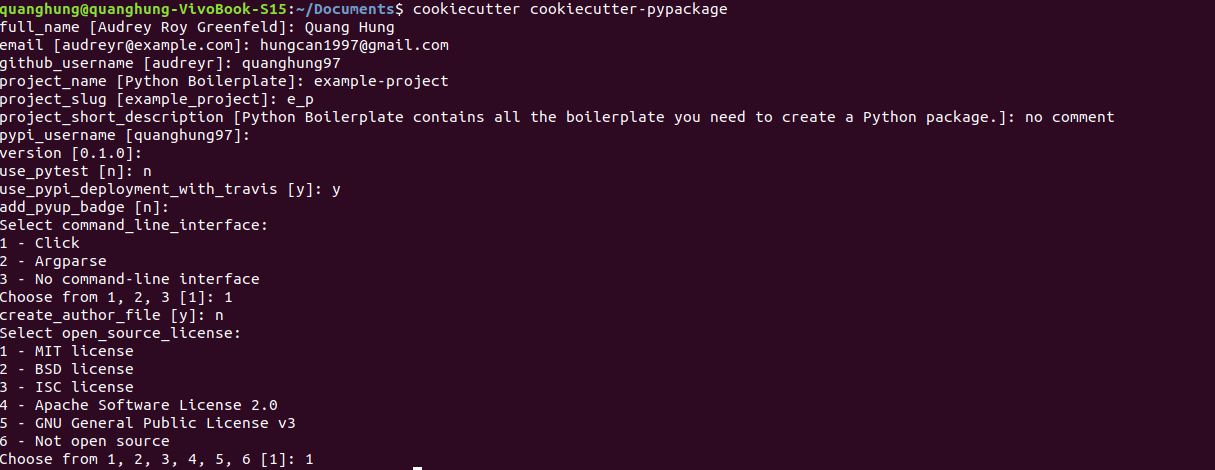 Sau khi chạy xong chúng ta có 1 loạt các options tùy chỉnh, tên dự án, slug, author, license... Hay có cài đặt thêm các tính năng như pytest, thư viện khác tùy vào mục đích sử dụng.