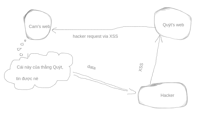 Cam có một trang web sử dụng CORS, được cấu hình cẩn thận. Trong whitelist của Cam có anh bạn Quýt. Không may Quýt có lỗi XSS, thế là hacker lợi dụng web của Quýt gửi tới trang của Cam, Cam thì tin tưởng bạn mình nên là gửi trả lại data và hacker nghiễm nhiên lấy được nó.