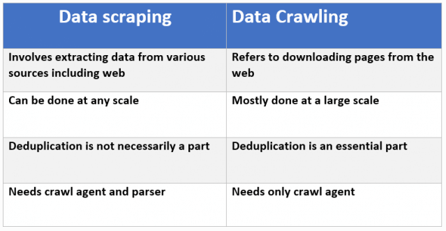 Scraping dữ liệu không nhất thiết phải liên quan đến web. Scraping có thể đề cập đến việc trích xuất thông tin từ một hệ thống cục bộ, cơ sở dữ liệu chung hoặc thậm chí từ internet. Web Scaping cũng thực hiện việc tìm kiếm và thu thập thông tin nhưng khác với Web Crawling, Web Scraping không thu thập toàn bộ thông tin của một trang web mà chỉ thu thập những thông tin cần thiết, phù hợp với mục đích của người dùng. Trong WebScraping chúng ta cũng phần nào sử dụng WebCrawler để thu thập dữ liệu, kết hợp với Data Extraction (trích xuất dữ liệu) để tập trung vào các nội dung cần thiết.
