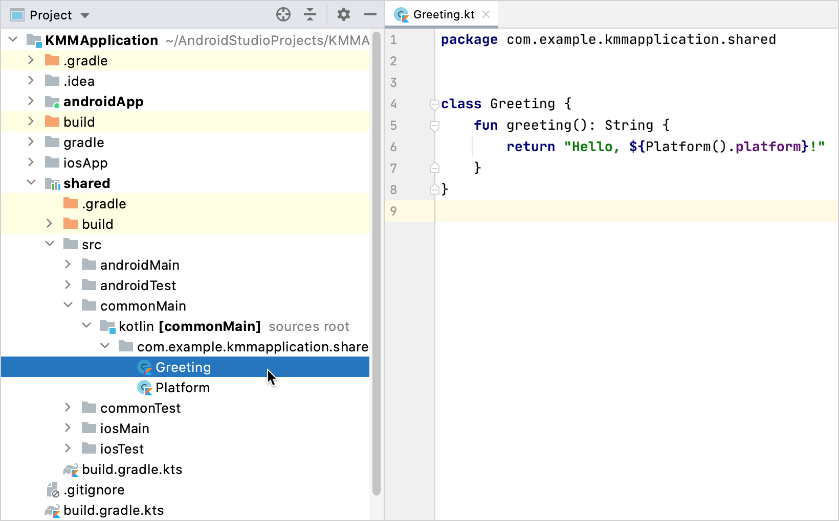 1.Mở file Greeting.kt trong shared/src/commonMain/kotlin/com.example.kmmapplication.shared. Thư mục này lưu trữ mã được chia sẻ cho cả hai nền tảng - Android và iOS. Nếu bạn thực hiện các thay đổi đối với mã được chia sẻ, bạn sẽ thấy các thay đổi trong cả hai ứng dụng.