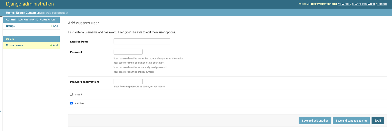 Run server, login vào admin site. Bạn có thể add user với email như thông thường.