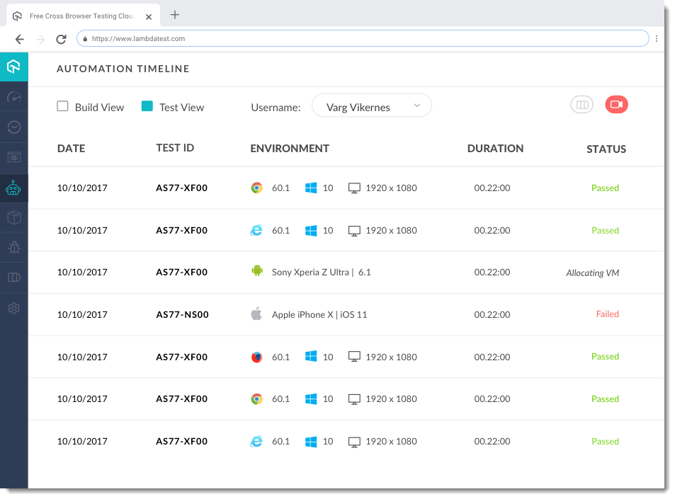 LambdaTest là một công cụ trực tuyến được sử dụng để thực hiện test trình duyệt tương tác trực tiếp trên các trang web và ứng dụng web được publish hoặc tại local của bạn trên 2000 trình duyệt di động và máy tính để bàn thực sự chạy trên hệ điều hành thực. Gỡ lỗi trong thời gian thực trên cả trình duyệt máy tính để bàn và thiết bị di động với các công cụ gỡ lỗi tích hợp.