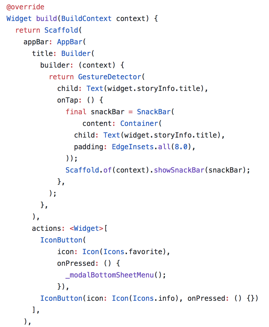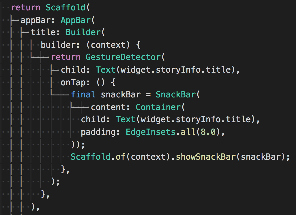 Điều này sẽ giúp code UI dễ đọc hơn rất nhiều nhưng cũng là nhược điểm của Flutter. Do có tooling support tốt nên việc Flutter không chọn một ngôn ngữ khác để code UI (như JSX trong RN) sẽ là điểm yếu của nó ở những nơi tooling này không hoạt động như trên Github chẳng hạn: