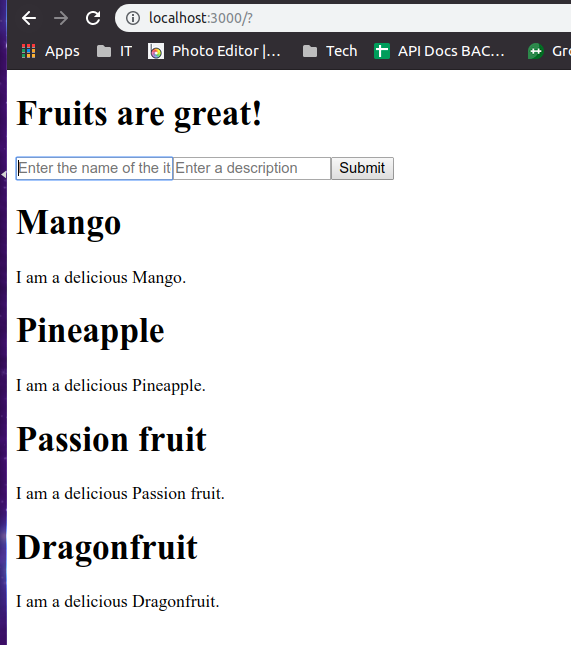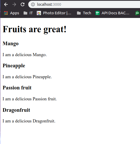 Khởi động lại server và truy cập vào đường dẫn localhost:3000 và nhận thành quả nào. Trang web được hiện lên với dòng chữ "Fruits are great!"