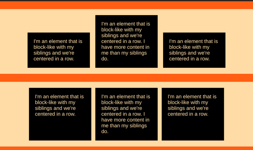 Nếu bạn có 2 hoặc nhiều hơn một phần tử block cần căn giữa theo chiều ngang trong một hàng thì tốt nhất bạn nên thay đổi cách display sang kiểu khác(inline-block chẳng hạn). Dưới đây là ví dụ khi sử dụng inline-block và flex: