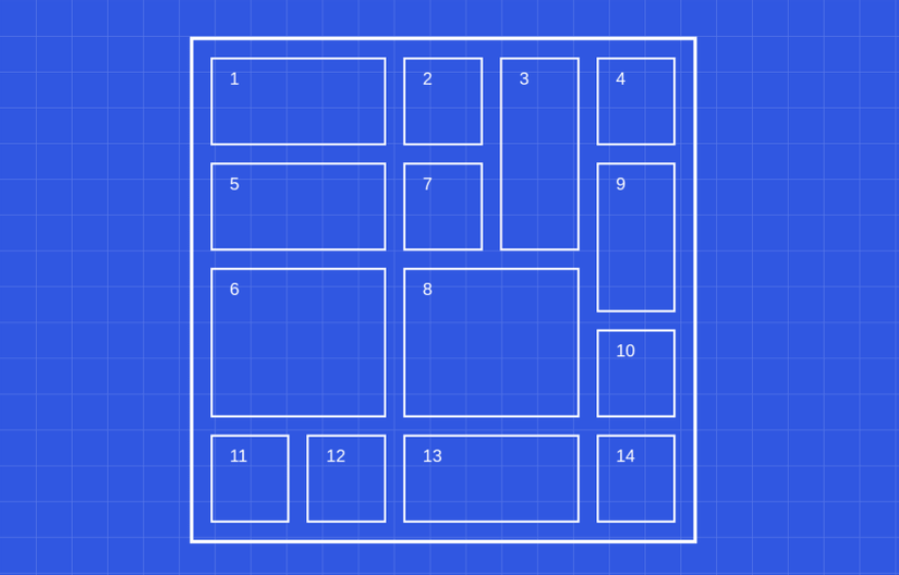 Tôi sẽ bắt đầu bằng cách implement grid. Tôi đã hình dung ra một grid gồm 24 cột và 14 hàng hoạt động khá tốt cho việc này. Mã CSS sẽ trông như thế này: