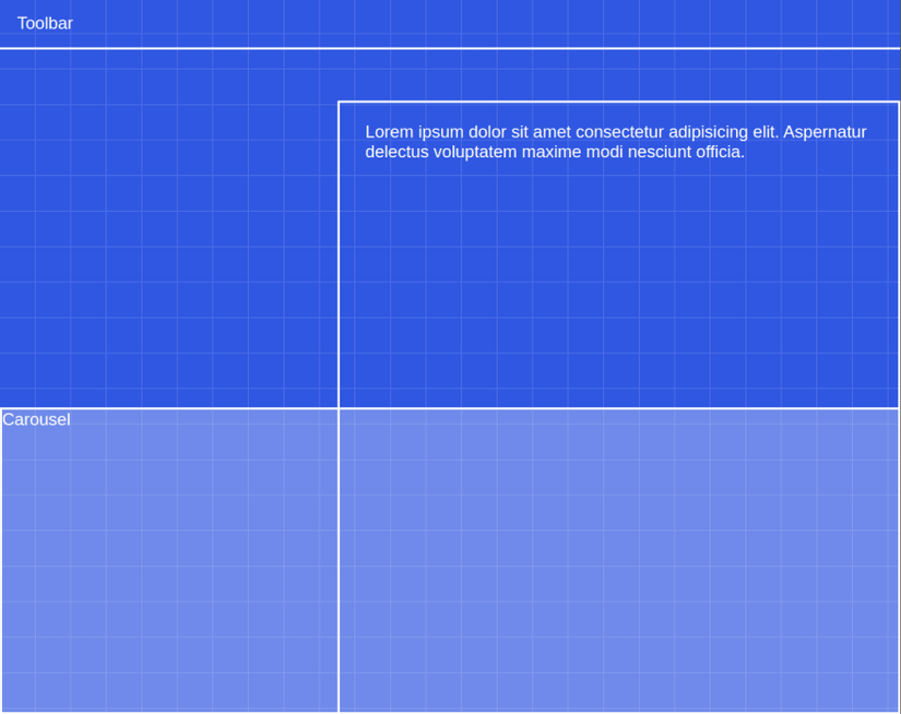 Tôi sẽ chia trang thành các yếu tố khác nhau. Ở đầu chúng ta có toolbar, sau đó chúng ta có khu vực title chính ở giữa bên trái. Tôi có panel màu trắng, và cuối cùng, tôi có carousel (với ba buttons lớn). Tôi sẽ làm việc với mẫu bên dưới đại diện cho các khu vực khác nhau mà tôi đã đề cập: