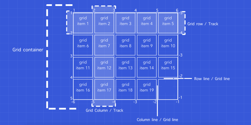 Như chúng ta thấy trong hình trên , grid container là một tập hợp các cột và hàng. row là khoảng trắng giữa hai dòng liên tiếp (đường ngang) và column là khoảng cách giữa hai đường cột liên tiếp (đường dọc). Một hàng có thể được gọi là một track và tương tự cho một cột. Vì vậy, một grid track là một không gian giữa hai grid-lines song song.
