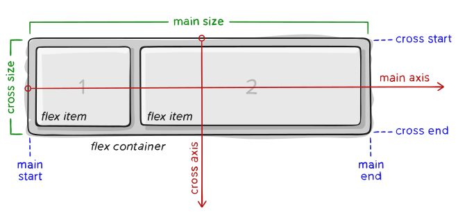 Tất cả các phần tử trong container đều được layout theo main-axis và được bắt đầu từ main-start đến main-end hoặc cross-axis và bắt đầu từ cross-start đến cross-end.